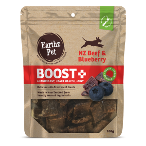 Earthz Pet BOOST+ treats are made with high quality human grade proteins, air dried and enhanced with a key nutraceutical to not only give your special pet a treat or reward, but to ensure its health is always recognised as important! No Grains; No Artificial Colours, Flavours or Preservatives; 95% Meat with Green Lipped Mussel; Air Dried In Beef & Blueberry flavour.